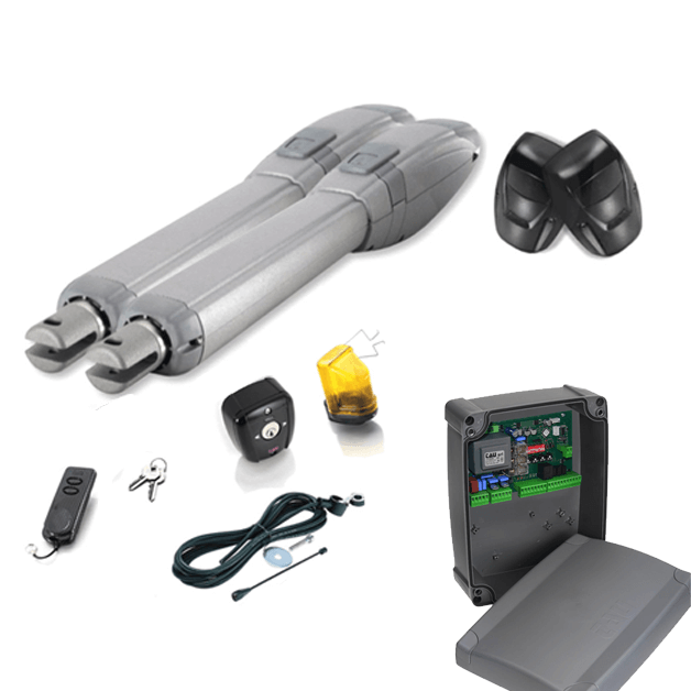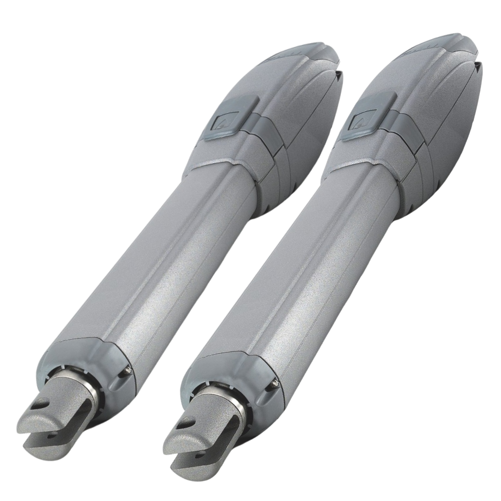 Komplet svingport sæt til 4 meters portplade - 18V Professionel portautomatik til portblade Komplet sæt bestående af 2 stk. elektriske lineære aktuatorer, kontrolboks med indbygget modtager, fjernbetjening, fotoceller, advarselslampe, nøglelås og antenne.