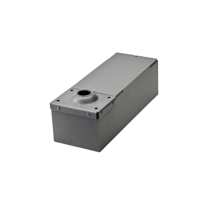 Denne indbygningsboks i pulverlakeret stål fra TAU bruges til indstøbning i beton. Til montage af svingport automatik fra R18 serien.