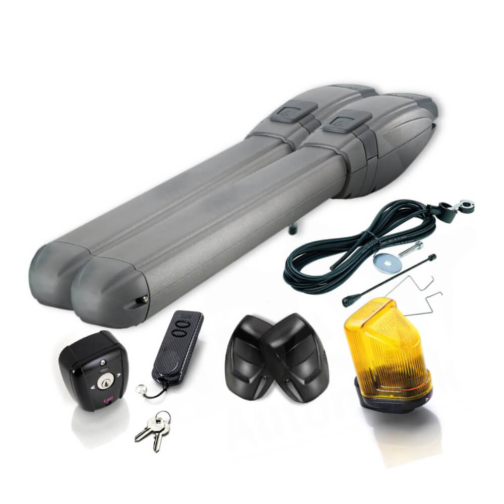 Komplet svingport sæt til 4 meters portplade - 18V Professionel portautomatik til portblade Komplet sæt bestående af 2 stk. elektriske lineære aktuatorer, kontrolboks med indbygget modtager, fjernbetjening, fotoceller, advarselslampe, nøglelås og antenne.
